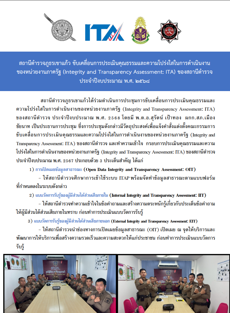 สถานีตำรวจภูธรเขาแก้ว ได้ดำเนินการประชุมการขับเคลื่อนการประเมินคุณธรรมและ ความโปร่งใสในการดำเนินงานของหน่วยงานภาครัฐ (Integrity and Transparency Assessment: ITA) ของสถานีตำรวจ ประจำปีงบประมาณ พ.ศ. 2567 โดยมี พันตำรวจโท สมนึก ดอนแนไพร สารวัตรสถานีตำรวจภูธรเขาแก้ว เข้าร่วมการประชุม ซึ่งการประชุมดังกล่าวมีวัตถุประสงค์เพื่อแจ้งคำสั่งแต่งตั้งคณะกรรมการขับเคลื่อนการประเมินคุณธรรมและความโปร่งใสในการดำเนินงานของหน่วยงานภาครัฐ (Integrity and Transparency Assessment: ITA) ของสถานีตำรวจ และทำความเข้าใจ กรอบการประเมินคุณธรรมและความโปร่งใสในการดำเนินงานของหน่วยงานภาครัฐ (Integrity and Transparency Assessment: ITA) ของสถานีตำรวจ ประจำปีงบประมาณ พ.ศ. 2567